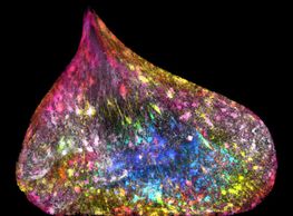 Human iPSCs carrying a triplication in the synuclein gene were differentiated into human dopaminergic neurons by applying various small molecules that mimic the signals associated with dopaminergic cell differentiation in mammalian neurodevelopment. Neurons were differentiated for 80 days at which point they were fixed and stained for MAP2 to identify neurons and two further proteins of interest that are key to Parkinson’s disease pathogenesis. The image displays MAP2 staining to identify cells appropriate for further examination and was acquired using a 60X objective attached to a Zeiss Airyscan LSM980 microscope in the Micron facility. The image was post-processed in ImageJ where a colour encoded depth-based filter was applied to the complete 10x10 tiled set of z-stacks, consisting of approximately 8,000 individual images projected in z to show the entire network in this combined field of view.