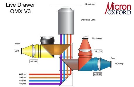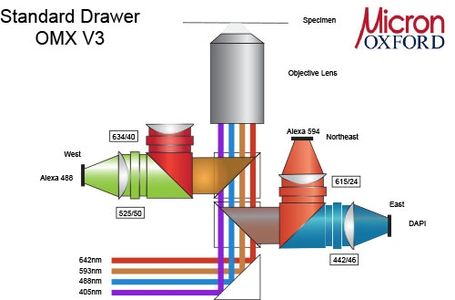 3D Structured Illumination mode: in this mode the system uses structured illumination and computer processing to generate 3D image stacks with twice the conventional resolution, ie just over 100nm in XY and about 250 nm in Z.