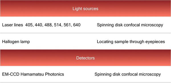 The UltraView system is mounted on an IX81 Olympus inverted microscope with environmental chamber for temperature and CO2 control. It is equipped with an electron-multiplying charge-coupled device camera (EM-CCD Hamamatsu Photonics) and it has 6 laser lines, 405, 440, 488, 514, 561 and 640 nm. This allows a very wide range of fluorescent probes to be used on the system. The system is run by Volocity software.